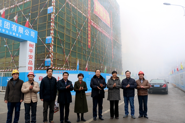 12月20日上午,校党委书记郭翠芬、校长范素华、副校长贺兴利,在基建处负责同志的陪同下,到8号学生公寓建设工地现场视察和指导工作,并与平安集团相关领导进行了座谈。 座谈会上,校领导一行仔细听取了基建处、监理和平安建设集团现场负责人关于项目施工进展情况的汇报,深入了解在建项目施工进展情况,对施工中的质量、安全等情况进行了询问,并对工程质量、工地管理等方面提出了指导意见。随后,校领导实地察看了工程进展情况。 校领导强调,在施工中要坚持安全第一,切实提高安全意识,确保施工人员、工作人员及施工过程的安全;坚持质量至上,认真执行施工标准,严格把控施工材料和关键工序,确保工程建设的质量。基建处与施工和监理单位积极配合、及时沟通,协调解决工程各阶段出现的问题,加快推进工程建设进度,保证按时完成建设。 目前,8号学生公寓主体框架已封顶,预计2017年8月投入使用。8号学生公寓建筑面积16125.43平方米,是我校学生宿舍中单体面积最大、投资最多的一个项目。8号学生公寓建成后,为进一步改善我校教育发展提供了有利条件。