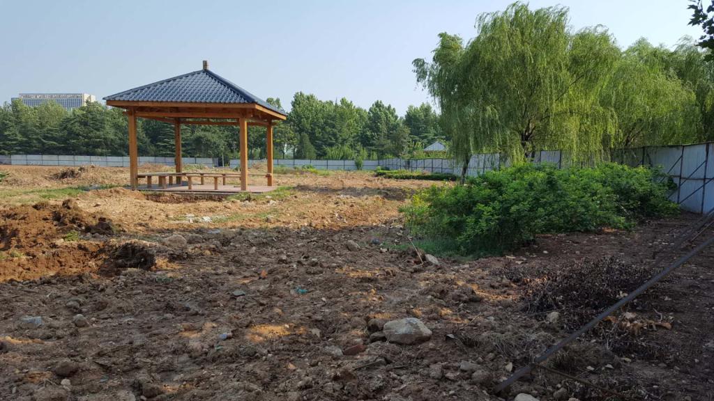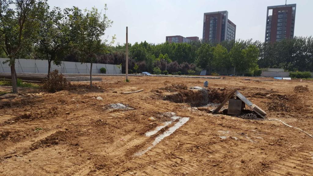 施工现场围挡已基本搭设完成,临建基础已砌筑完成,办公用房(集装箱)将于近期进场安装,场地内树木、花砖已移除,临时用水已接入。目前正在完善道路硬化、临建安装等临时设施。